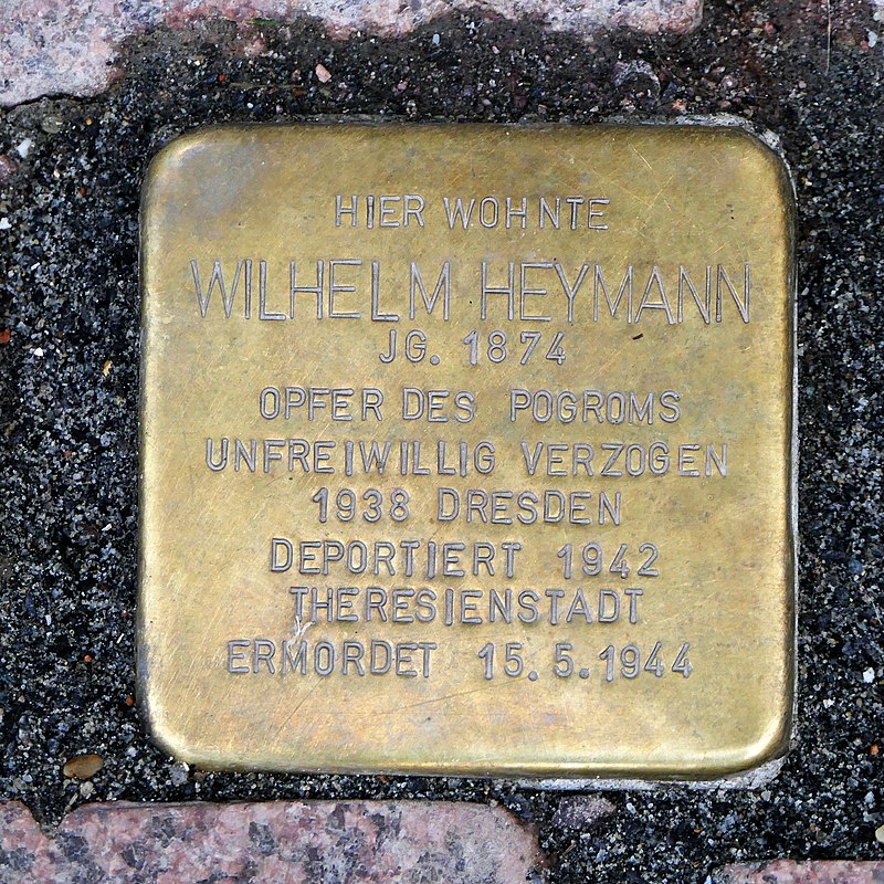 Am 28. November sahen wir uns nun nach langer Pause wieder in der Lage, durch den Kölner Künstler Demnig 3 weitere Stolpersteine verlegen zu lassen. Das fand am 28. 11. ab 13.30 Uhr vor dem Eingang Elbstrasse 32 statt, wo Wilhelm und Elisabeth Heymann ihren letzten frei gewählten Wohnsitz hatten. Sie gehörten zu den bekanntesten Kaufmannsfamilien unserer Stadt. Sie wurden nach Theresienstadt